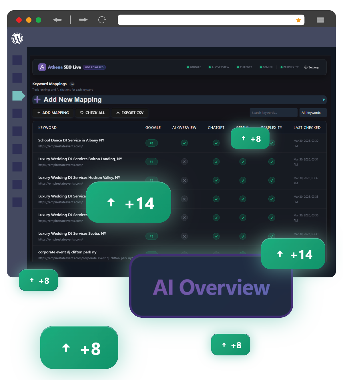 Athena SEO AI helps wedding and event DJs rank in Google, AI search, and local results, so couples find you before your competition.